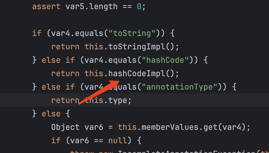 在AnnotationInvocationHandler#invoke中被调用,其实我们一看就知道是有关动态代理的类,若调用了代理类实现的接口方法的话就会自动调用到invoke方法,我们看到代码调用到equalsImpl的条件是,这个方法必须为equals,并且要求有一个参数个数,要调用到equals()