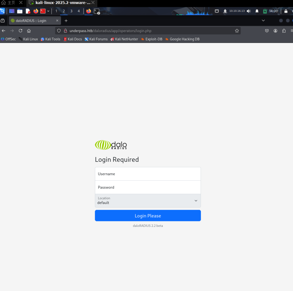 扫描得到http://10.10.11.48/daloradius/app/users/login.php,利用默认凭据登陆失败