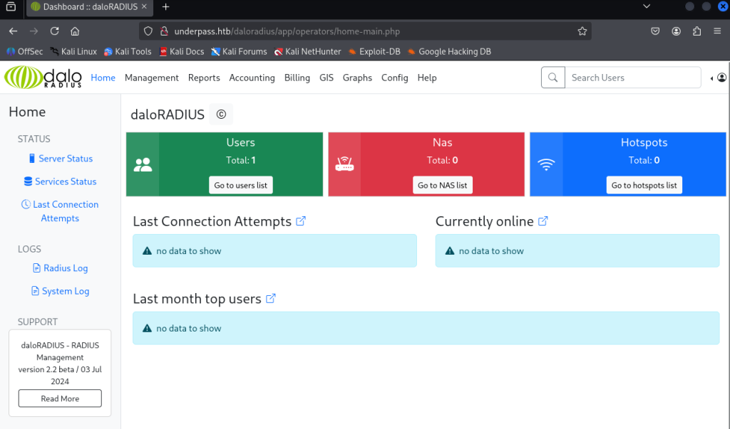 Service Info: Host: UnDerPass.htb is the only daloradius server in the basin!